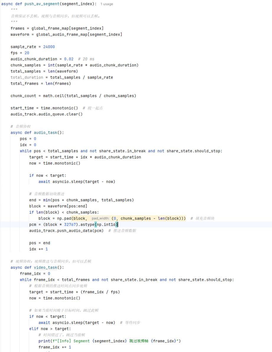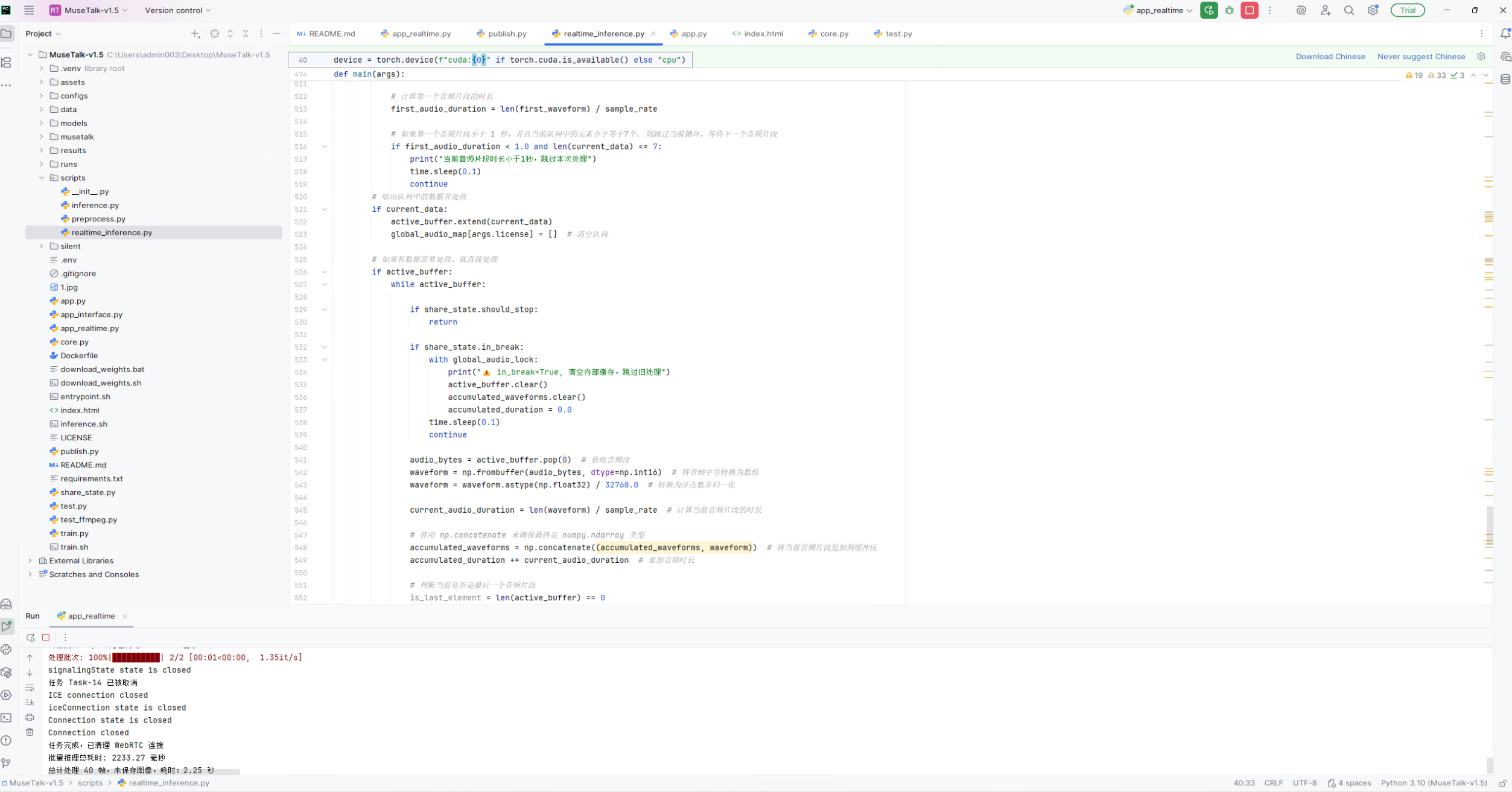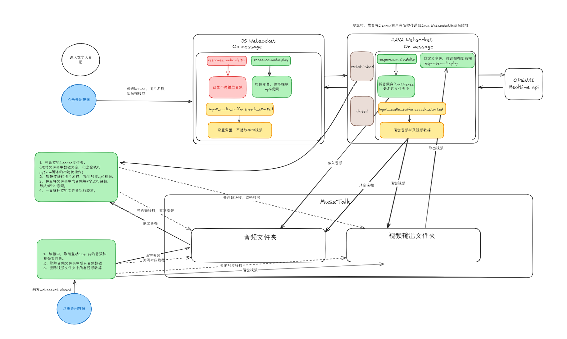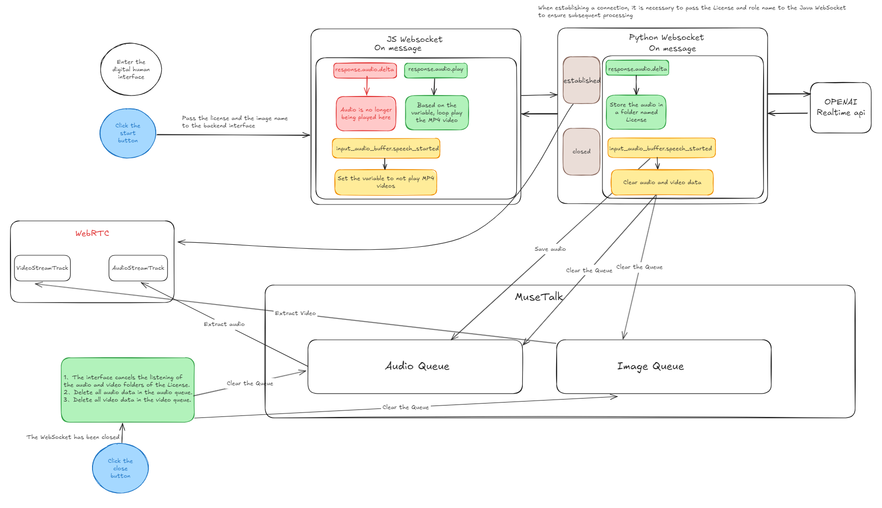 基于MuseTalk的二次开发以满足实时推理:适配Websocket实时基础架构,以满足实时推理要求。学了两天的python,就上手修改了。最难的还是对于音频的处理,包括修改核心源码的转码部分、说话打断时的音频队列处理逻辑、音频的分段处理算法策略等等。